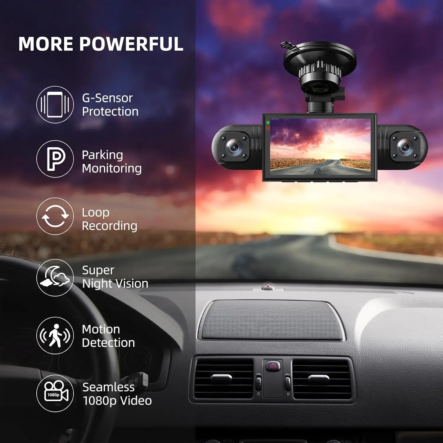 A full HD 1080P car dash camera system with four lenses for complete front, rear, left, and right coverage. Features night vision, G-sensor for collision detection, and a parking mode for security while parked. The 3-inch IPS screen provides clear playback, and the system supports external microSD storage.