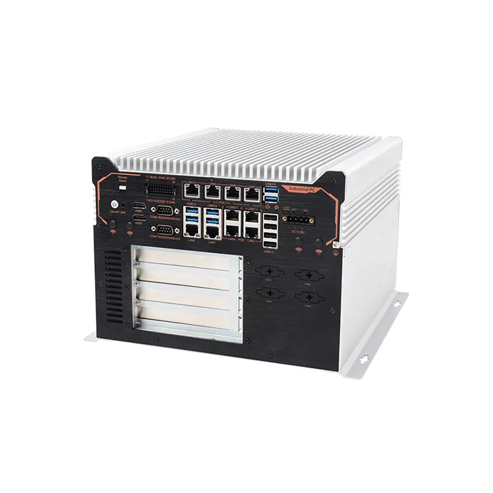 This fanless industrial PC is designed for demanding applications, featuring a 12th Gen Intel processor (i3, i5, i7, or i9), up to 64GB RAM, and 64GB of storage with a swappable design. It supports multiple PoE GbE LAN ports, making it ideal for industries requiring robust computing solutions. With a rugged design and versatile connectivity options, this industrial PC is perfect for embedded systems, surveillance, and industrial control.